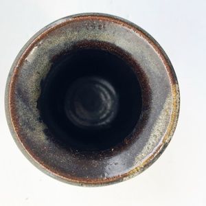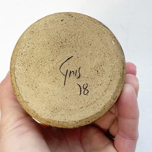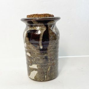 Beautiful handmade jar with aged cork lid. This studio pottery jar would look stunning styled on a shelf or used to hide your stash, like tea. In good vintage condition, no chips or cracks. Made of a weighty earthenware ceramic, and would have been originally been a storage pot used for the sale of everyday food items, often referred to as a ‘mustard pot’. It is deep and cylindrical, with a wide, circular mouth, and is glazed with a high shine.