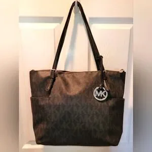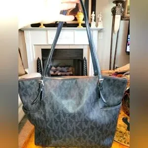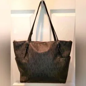 Black and gray Michael Kors tote with side pockets. Medium sized tote. Great for Everyday use. The handles have wear on them but still usable. Please see all photos for more details and description of the bag. Thanks