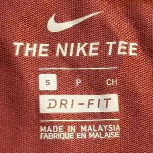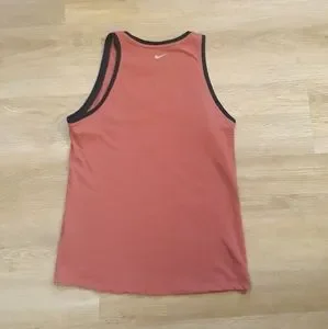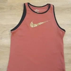 The Nike Tee. Dri Fit Tank Top. Size: Small. Color: Red with Gold Glitter Swoop. Black Trim on Arm Cuffs.