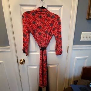 LAPIS red wrap dress, with black belt. 3/4 length, mandarin style sleeves. Size S.