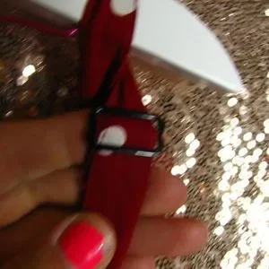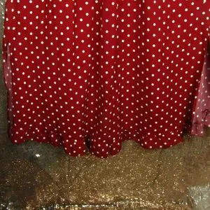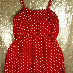 Short sleeve. Midi length. Summer Fun Dress. Red with white polka dot. Cold shoulder neckline with adjustable straps and a ruffle sleeve. Elastic waist.