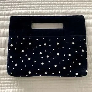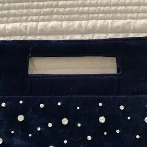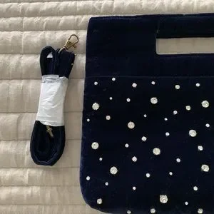 NWT Anthropologie velvet purse. Navy blue with rhinestones on both sides. Inside zip pocket. Strap included to be worn as a crossbody or over the shoulder. This is a stunner.