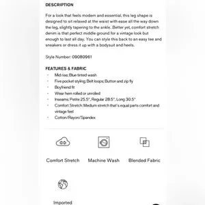 For a look that feels modern and essential, this leg shape is designed to sit relaxed at the waist with ease all the way down the leg, slightly tapering to the ankle. Better yet, comfort stretch denim is that perfect middle ground for a vintage look but enough to last all day. You can style this back to an easy tee and sneakers or dress it up with a bodysuit and heels.