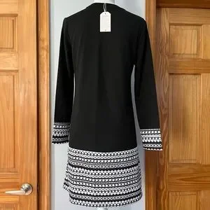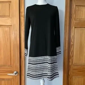 NWT Geometric design dress in black, white gray size Small. Black dress with geometric designs at the dress bottom and cuff. Perfect all year long.
