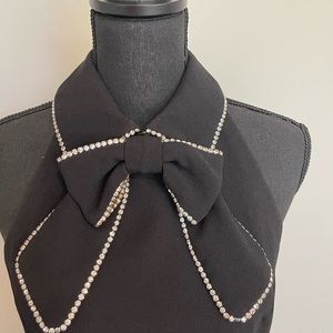 Trina Turk Festive Rhinestone Black Bow Tie Dress Sz 2. Black crepe sheath dress features high neck with collar and bow trimmed in rhinestones. There is an attached ribbon on the bow which can be pulled under the collar to tie in back to keep the bow in place. Back zipper. 100% polyester and fully lined. Worn only once to son’s rehearsal dinner. Cared for in a SMOKE FREE HOME!