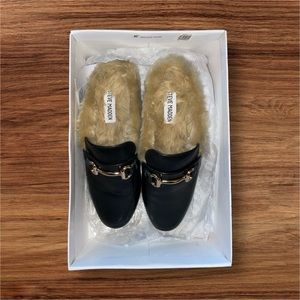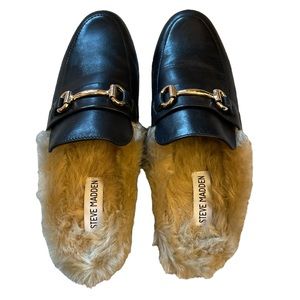 These black leather loafers have never been worn. With a fur lining and gold buckle detail, they are comfortable and very stylish. They’re the perfect shoe to slip on to elevate an outfit. NWT and box.