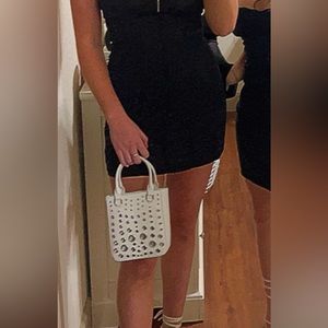 Super cute. Chain is detachable and purse has handles. Metal grommets