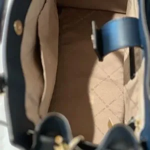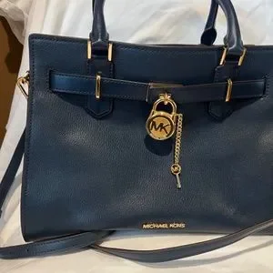Beautiful navy bag with gold accents in hardware outside. Inside is a zippered pocket on one side and an open pocket on the other. An additional adjustable long strap to carry over the shoulder comes with it. The strap clips on and off easily and has the gold hardware. Bag is 13” across.side to side, bottom side gusset is 7”, top to bottom or depth is 10”. The gold lock on front has a key that unlocks it and can release the top portion of the bag to open top wider creating a box-like look. I have only carried it a few times-it was larger than I needed. It’s like brand new, no scratches , scuffs or ink marks.
