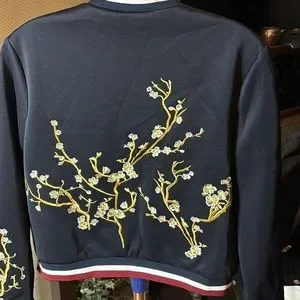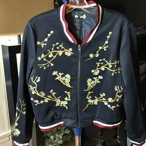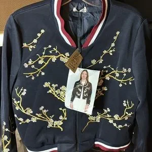 NWT Holly Bracken Navy with Cherry Blossom embroidered design bomber jacket. Size small.