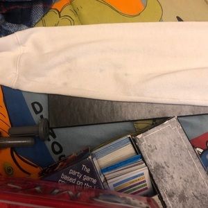 This does have FLAWS- spots & discoloration on the arms & drawstrings. However UNTREATED so may come out in wash. This definitely shows wear-so please NOTE before purchasing! NO HOLES/RIPS!