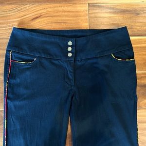 Black dress pants with red and yellow piped lining down the side of the legs. Flare leg.