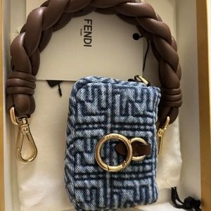 Nano version of the iconic Baguette bag, with flap and oversized FF closure with magnetic clasp. The clip means that it can be attached to larger bags or belts, while the handle is designed for carrying it by hand. Credit card holder flat pocket inside. Made of a worn-look blue denim with an FF quilted motif. Blue denim lining. Brown braided nappa leather handle. Gold-finish metalware.