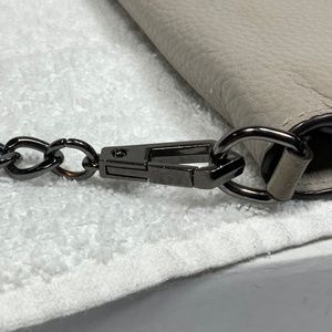 Light Gray Pebbled leather with Removeable Leather and black chain Crossbody strap that has a drop of about 23"