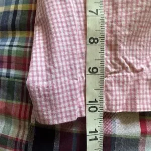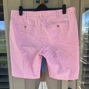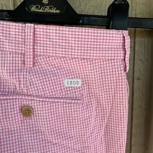 In beautiful shape, as bright and clean as the day they were made, rarely worn. Showing no signs of use or wear, free of stains, picks, pulls, holes or tears. From IZOD in 💯 soft pink and white gingham cotton featuring a flat front, button waist closure, metal zipper, dual button rear pockets and IZOD branding badge above the right rear pocket. Men’s Size 38, please see the total length and inseam measurements in the pictures. $60 retail. Check out my Closet for more great shorts for Men and Women. Thanks for looking.