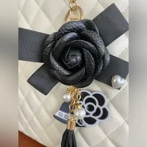 This camellia flower keychain doubles as a bag charm and is beautifully embellished with charms, rhinestone accented faux pearls, ribbon and leather tassel. Add this gorgeous little luxury to your car also! Also makes a great gift. Unbranded