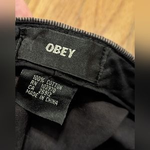 Obey cap from early 2000's. Six-panel design with flexible, shallow brim and band around front. Obey logo on a brass shield attached to leather strap detail on hat band. Black and brownish-gray pinstripes.