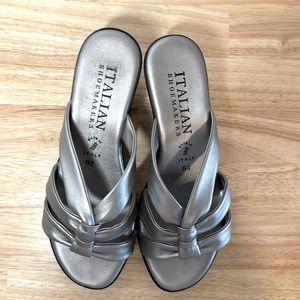 NWOT Italian Shoemakers silver man-made leather sandals size 8.5 made in Italy buttery soft. Extra cushioned leather soles for comfort. 2.5 inch heels. Black plastic outer soles. Look and feel wonderful!