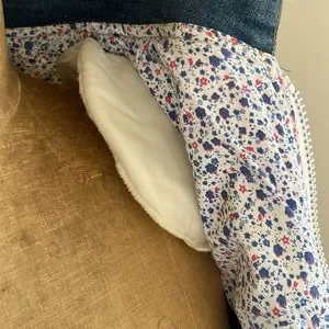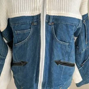 1980’s Vintage Denim multi pocket Jacket with White ribbed cotton detailing and black faux leather arrows on front pockets! This is a seriously cooler than cool jacket! Oversized fit and very comfortable! The cutest floral cotton lining! Marked size L. Fits size small-large depending on desired fit. Removable shoulder pads! Dolman style sleeves. Same style jacket worn by loveshackfancy owner Rebecca cohen’s mother (see photo).