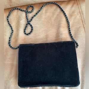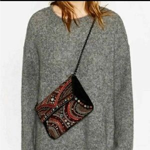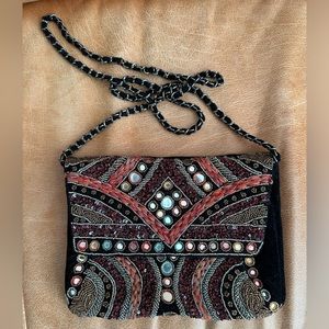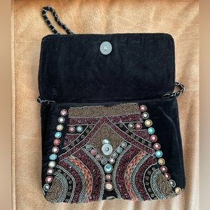 Super fun clutch/chain bag from Zara with Moroccan style mirror and appliqué details. Black velvet with multicolor accents.