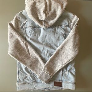 Light blue denim with Heathered Gray sleeves and hood for “layered look”. Denim portion has buttons