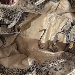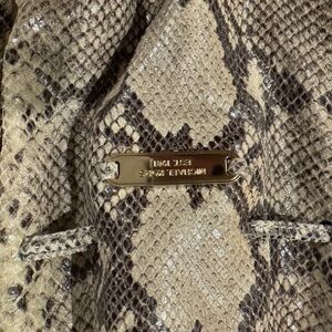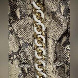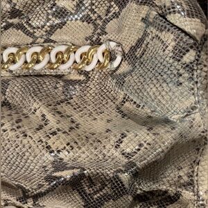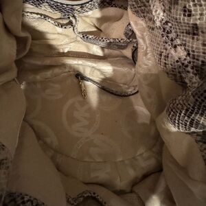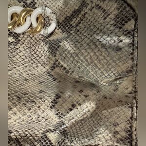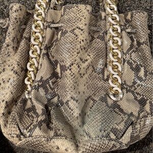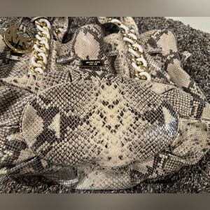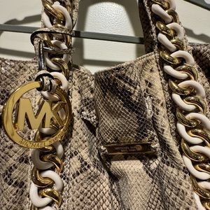 Michael Kors snakeskin handbag with gold and white hardware accents. There is some blue jean transfer on bottom back of bag