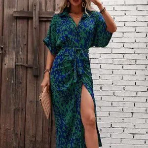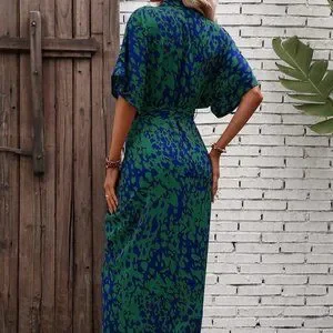 Multicolor Boho Womens Allover Print Batwing Sleeve Belted Shirt Dress