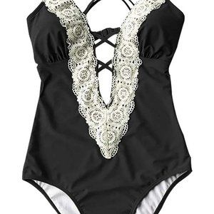 Design: Plunge neck, Lace inserts, Crisscross straps, High cut design