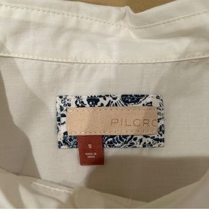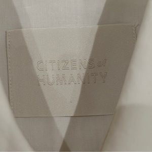 Four white button up ladies long sleeve oversized shirts, one size small by Pilcro, One citizens of humanity size extra extra small, one universal threads, size medium, and one Eileen Fisher extra small.