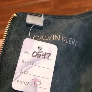 Never worn. No flaws. Stretchy faux suede bodycon dress. Made well. Exposed gold zipper in the back with Calvin Klein on the pull. Short tulip sleeves. Unlined. Poly/Spandex blend. See photos for measurements and material content. Fits true to size (per their website).