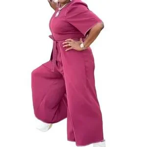 Attractive Cranberry Jumper with white stitching. Faux wrap culottes like jumper. Great for summer or spring with wedges or sandals.