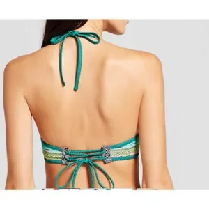 Shade & Shore Torquiose Gold Strappy Halter Bikini Top 38DD underwire molded cup