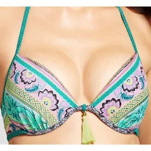 Dance in the sun in this lovely green pattern Shade & Shore bikini top. This Shore Light Lift halter bikini top has an underwire and molded cups for just the right amount of lift. A halter and strappy back tie closure offers an adjustable fit with a sexy front tassel. Extra styling details include gold bead accent along V neck, gold stitching, and contrast fabric along edges.
