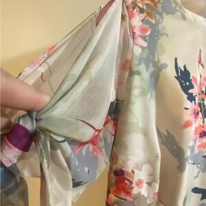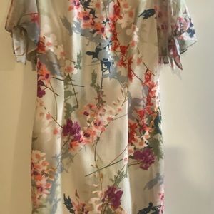 Beautiful floral dress by Nicole Miller. Has split on each shoulder/sleeve with a small bow sash at the end of each sleeve. This is a perfect dress for a wedding guest or summer function.