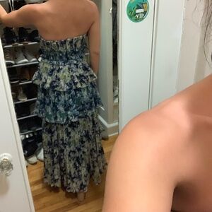 Beautiful sold out dress from AMUR in a really cool abstract blue and green print. Tiered ruffle style in 100% silk with boning throughout the bodice for a structured fit at the top.