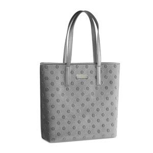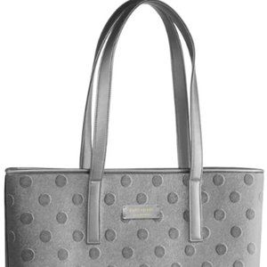 TOTE: Spacious velvet tote with pretty embossed polka dots throughout. Neoprene like inner. Approximately 18w X 15h X 4 deep.