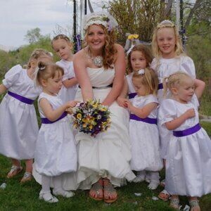 Features: Sleeveless, balloon skirt with tulle, purple ribbon belt, 12" long zip closure on back
