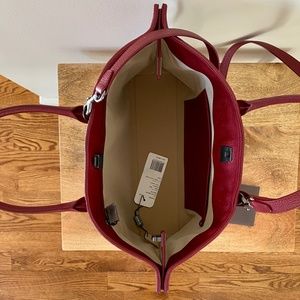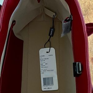Brand new with original tag attached Akris Ai crimson red woven tote bag with gunmetal hardware, rolled handles and single shoulder strap. Bag features canvas lining with three interior pockets, turn-lock closure at front and push-lock closure at top as well as protective feet at base. Bag came out in May 2021 and has completely sold out. Includes dust bag.