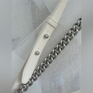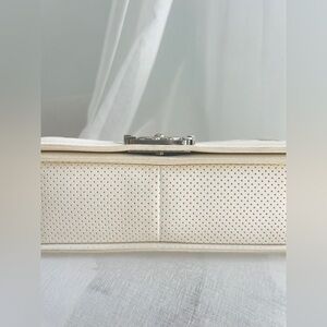 This stylish shoulder bag is crafted of luxuriously textured perforated lambskin leather with a peripheral linear quilt along the edges. The bag features an adjustable silver metal chain link shoulder strap with a white leather shoulder pad and a silver Chanel CC press-lock. The flap opens to a smooth white leather and fabric interior with a patch pocket.
