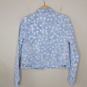 Super unique light blue and white distressed denim jacket with a rose floral print. Button front.