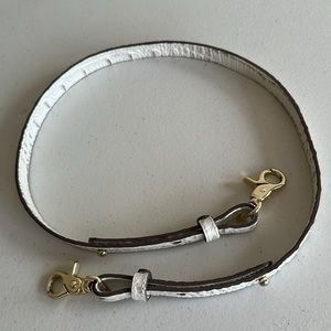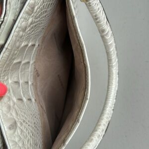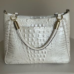 This handbag is genuine croc embossed leather and is pearlized creamy-white with light taupe color on croc raised ridges. Features a zip top closure, removable adjustable shoulder strap, interior zip pocket, two slip pockets, small zip pocket, pen pocket, key clip, and footed bottom. Good condition. See photos. No worn areas noted. Original dust bag.