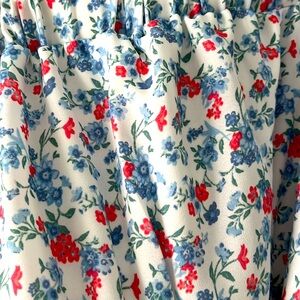 NEW WITH TAG STILL ATTACHED. red green white and blue floral romper with removable tie belt. ruffle sleeves