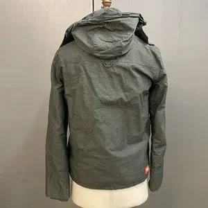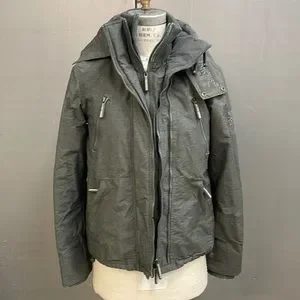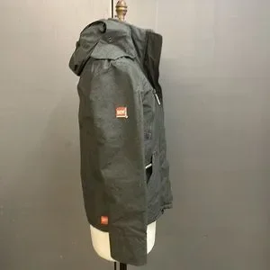 Many cool details. Double front zipper closures. Deep zippered outer pockets, inner pocket. Hood, knit interior collar, elasticized drawstrings with stoppers in hood, bottom. British designed, Japan inspired