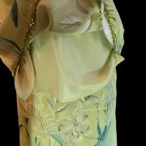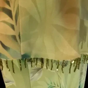 Top: sleeveless floral design hanging beads at hem on bottom scoop neck