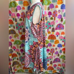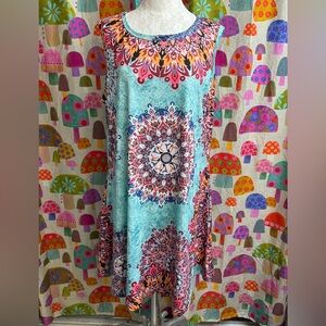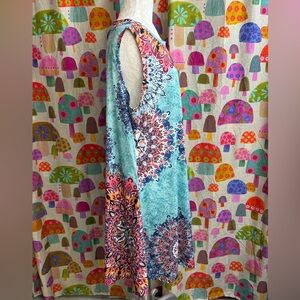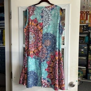 Beautiful summer dress! Would make a great beach cover up or night out. Very soft and stretchy. Lightweight. Pockets on both sides. Never been worn but has been washed. Polyester/spandex blend. 37” long. 23” pit to pit.