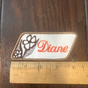 Vintage 1970’s Swiss Maid Quality Emblems Cursive Diane Patch Patch has brown outlined flower with Diane written in orange cursive Cloth embroidered patch Not sure if it is iron on or sew on Not in packaging Collectible item Size shown in photos approximately 4 1/4”x 1 7/8” Never used