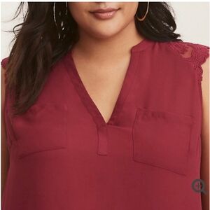 Georgette material tank. Burgundy color. Double breast pockets, v-neck, hi-low style, cute lace shoulder detail. Small snag as pictured.