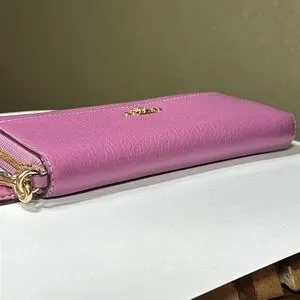 Coach Accordion Zip Wallet with Wristlet Strap in a HTF dusty lavender color with gold tone hardware. Outside is polished pebbled leather with front open pocket and wristlet strap. Inside is a smooth, refined calf leather in oxblood color. There are 12 card slots, 2 full-size bill pockets, and zippered coin pocket. Excellent condition.