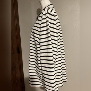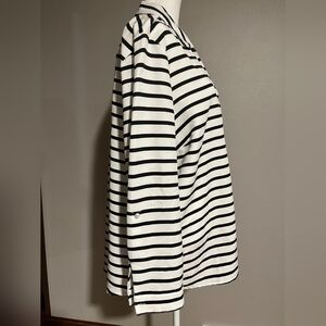Its timeless black and white stripes and 3/4 sleeves make it a versatile addition to any closet.