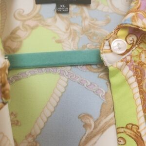 This gorgeous Versace print like shirt is sure to make quite a statement this spring. Knot it at the front or side over jeans for a fashion-forward look. Rolled up jeans and beautiful heeled sandals complete a incredible feels look.