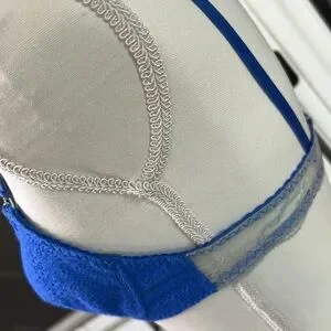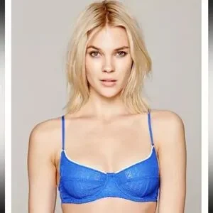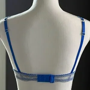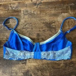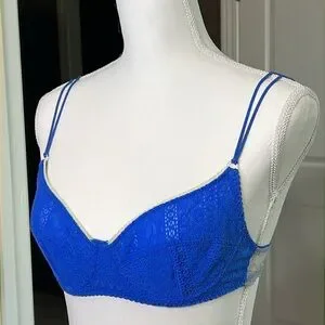 Intimately FREE PEOPLE Lace Balconette Bra. Underwire. Lightly Lined. Double Hook & Eye Closure. Adjustable Straps. Color is Hot Ocean Blue. Size 32C. Very Good Preowned Condition.